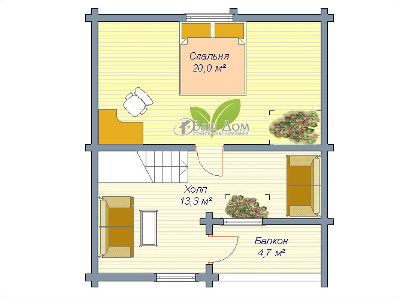 Проект светлого и уютного дома с мансардой для постоянного проживания семьи из 2–3 человек. Деревянный сруб площадью 77,8 кв. м отличается продуманной планировкой. На первом этаже находятся просторный лестничный холл, кухня-столовая и светлая спальня, у входа устроена небольшая терраса. На мансардном этаже находятся вторая спальня и большой холл с выходом на балкон.