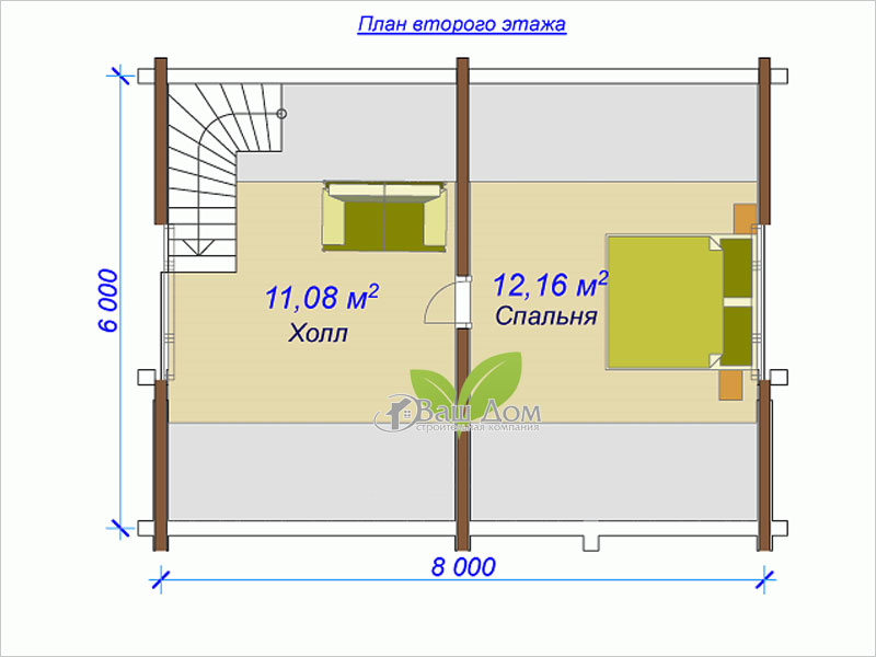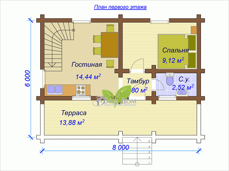 Проект деревянного сруба общей площадью 65 кв. м отлично подходит для постоянного проживания семьи из 2–3 человек. Планировка первого этажа удобная и продуманная: крытый тамбур с входом в санузел, уютная спальня и большая кухня-гостиная с лестницей на мансарду. У входа устроена широкая терраса под крышей. На втором этаже находятся холл и вторая спальня.